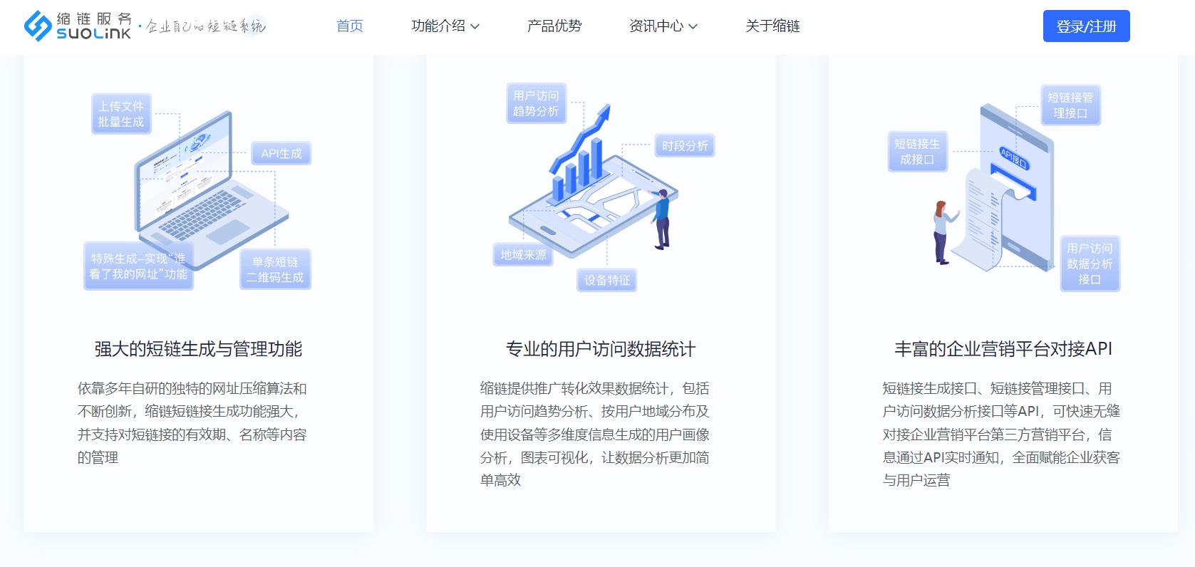 缩链短链接,平台技术过硬,支持海量并发,跳转速度快,长期稳定,多重链接防护技术,流量平台风控合作,防误拦屏蔽,防钓鱼劫持,避免了短链接被错误屏蔽拦截、被不良广告钓鱼劫持的问题,智能识别过滤假量访问,提供全年7*12小时企业微信及400电话客服支持,快速服务响应,复杂问题专业小组支持,故障解决7*24小时专业技术支持服务,VIP用户7*24小时专属客户经理服务。